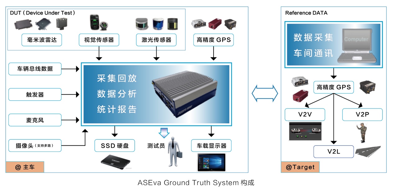 ASEva Ground Truth System 通过高精度定位设备及局域网通信技术,实现被测目标和本车运动参数获取,如位置、速度、加速度等参数,提供真值参考系统。 可应用于封闭场地内传感器或车辆感知功能测试,以及封闭场地内车辆 ADAS 功能测试 (V2V、V2P、V2L)。 ASEva Ground Truth System 也可通过高精度的真值传感器,如激光雷达,实现被测目标和本车运动参数获取,如位置、速度、加速度等参数,提供真值参考系统。可应用于开放道路传感器或车辆感知功能测试,以及开放道路车辆 ADAS 功能测试。 ASEva Ground Truth System 可提供丰富的传感器对标或感知功能测试报告